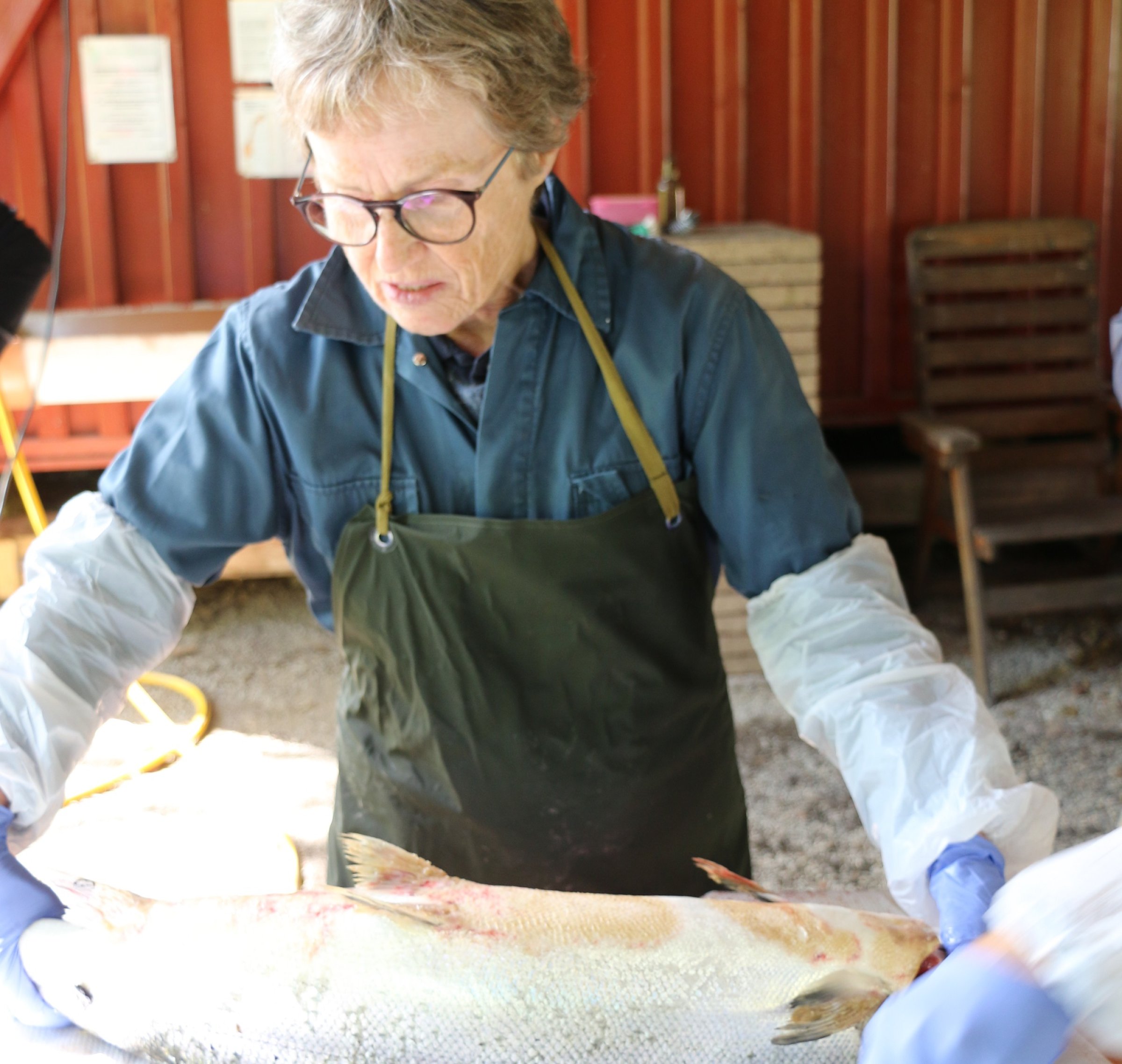 - Vi tar også skjellprøver fra fisken for å bestemme om det er villaks og hvor lenge den eventuelt har vært i sjøen. Videre måler vi hvor lang og tung fisken er,