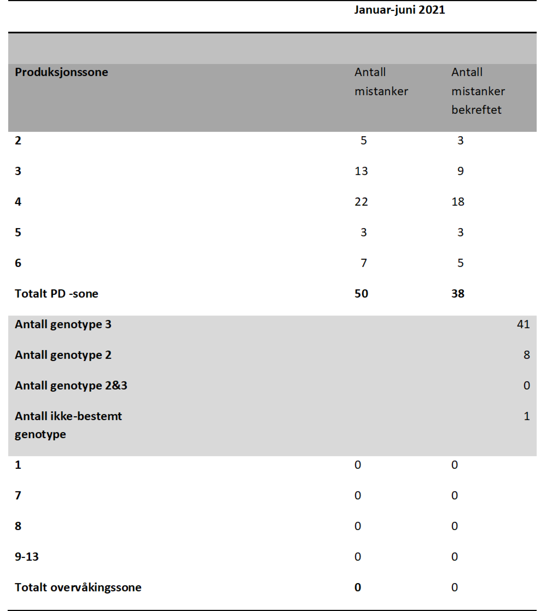 Tabellen viser en oversikt over antall innmeldte tilfeller med SAV-infeksjon og/eller PD for året så langt. Lokalitetene er oppdelt etter hvilken produksjonssone de befinner seg. I henhold til PD-forskriften (FOR-2017-08-29-1318), inngår produksjonssone 2-6 i PD-sonen, mens produksjonssone 1 og 7-13 inngår i overvåkingssoner.