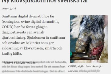 Alle nyheter Alle sykdommer og agens Dyreart Aflatoksiner Afrikansk svinepest Amøbegjelle-sykdom (AGD) Apekoppar Aviær influensa (fugleinfluensa) Bakteriell nyresyke (BKD) Blåtunge Campylobacter Caprin artritt / encefalitt (CAE) Diaré hos rådyr Fibropapillomatose - hudvorter hjå hjortedyr Fotråte hos sau Fotråte hos villrein Francisellose Fransk hjerteorm Furunkulose Gyrodactylus salaris Herpesvirusinfeksjon hos hest Hjerte- og skjelettmuskel-betennelseslignende sykdom hos regnbueørret Hjerte- og skjelettmuskelbetennelse Hjerteorm (Dirofilaria immitis) Hundens dvergbendelmark – Echinococcus granulosus sensu lato Husflått Infeksiøs hematopoetisk nekrose (IHN) Infeksiøs lakseanemi (ILA) Kaningulsott – rabbit haemorrhagic disease Kardiomyopatisyndrom (CMS) Klassisk svinepest Koldbrann på føtter og ører Kompleks gjellesykdom hos laks Krepsepest Lakselus Laksepox Landøyde Leishmaniose Listeria Louping ill Meticillinresistente stafylokokkar (MRSA) Miltbrann Mjøldrøye (Claviceps sp.) Munn- og klauvsjuke (MKS) Mædi Newcastlesyke (ND) Nodavirus hos marin fisk (VNN/VER) Pankreassykdom (PD) Parasittknuter i underhuden hos hjort Pasteurellose hos fisk Psoroptes ovis Q-feber Rabies Resistens mot bredspektrede cefalosporiner Resistens mot kinoloner hos Enterobacterales Revens dvergbandorm (Echinococcus multilocularis) Ringorm hos storfe Salmonella Saprolegniose Silbenssvulst hos elg Skrantesjuke eller Chronic Wasting Disease (CWD) Smittsom gastroenteritt (TGE) og porcint respiratorisk coronavirus (PRCV) Sviknott Tenacibaculose Toksoplasmose (Toxoplasma gondii) Tuberkulose Tularemi (harepest) Verotoksinproduserande E. coli (VTEC/STEC) Vintersår Viral hemoragisk septikemi (VHS) Vondarta katarrfeber hjå hjortedyr Yersinia enterocolitica (yersiniose) Yersiniose hos fisk - Yersinia ruckeri «Red skin disease» hos vill laks: en ny tilstand Fjørfe Geit Hest Kameldyr Oppdrettsfisk Sau Skjell Smådyr Storfe Svin Tamrein Tifotkreps Villfisk Vilt 2791 artikler Smittsom digital dermatitt (CODD) påvist i Sverige Rapport om sjøørret og lakseluspåvirkning Vaksineanbefalinger for rabies opprettholdes Ekstrabevilgning til Veterinærinstituttets regionale struktur Rabiesmistanke hos rev fra Svalbard avkreftet Pasteurella kan gi sykdom hos både laks og rognkjeks Bare halvparten av infiserte anlegg utvikler CMS Carlos das Neves ny president i Wildlife Disease Association e70f4436-afdf-40ff-8e75-d027a359b3e0 Forrige side 1 … side 107 side 108 side 109 … side 349 Neste Forrige side 1 … side 107 side 108 side 109 … side 349 Neste