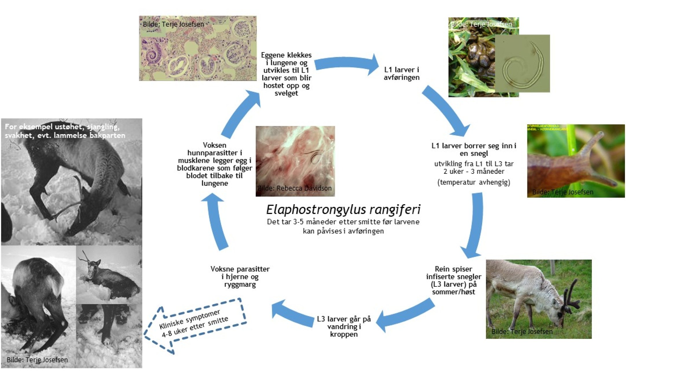 Parasitten har en indirekte livssyklus og er avhengig av mellomvert for å kunne fullføre livssyklus og opptre som parasitt hos endeverten som er rein. Ulike snegler fungerer som mellomvert og reinen får i seg disse ved beiting på sommer/høst (Figur 1 - trykk på bildet for større versjon).
